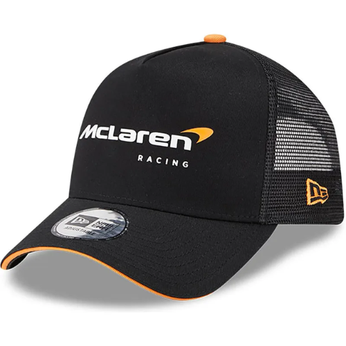 A sleek McLaren Racing Formula 1 trucker cap built on the New Era A-Frame silhouette. Finished in classic black, this hat blends modern motorsport branding with breathable comfort, making it perfect for everyday wear and race-day style.